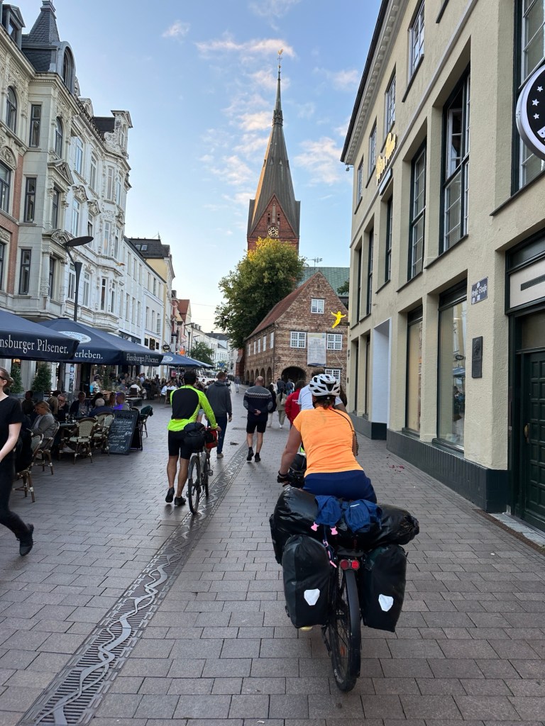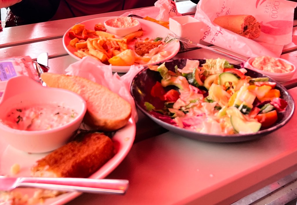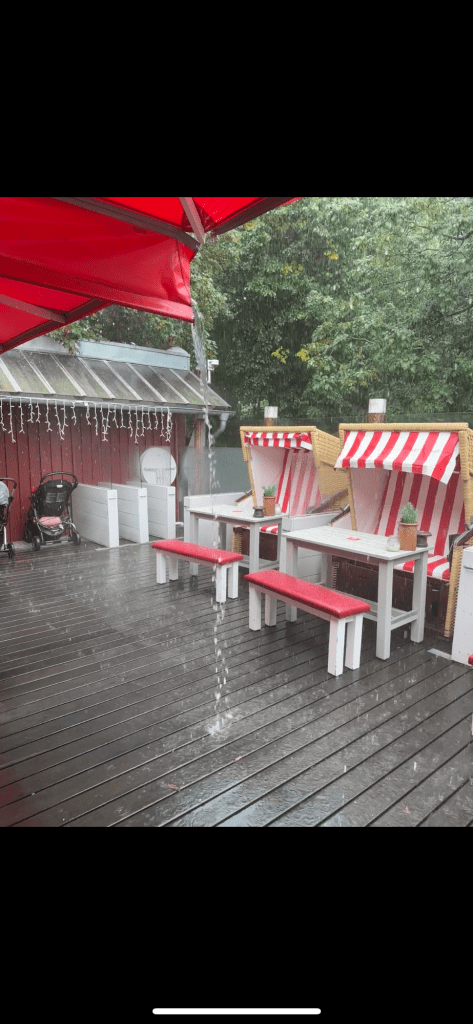 Die Kleine schläft nach der Abfahrt schnell ein und die Große hört Toniebox. Gegen 14:30 Uhr landen wir im Flensburger Hafen auf einem Spielplatz an. Die Kinder freuen sich über die Bewegung und die Geräte und schwärmen sofort aus. Das Vergnügen wird allerdings recht bald durch einsetzenden Regen beendet. Wir flüchten uns unter ein Klettergerüst und eine andere Familie tut es uns gleich. Während wir im einigermaßen Trockenen sitzen, überlegen wir, was wir essen wollen. Die Große möchte Fischbrötchen haben und nebenan gibt es einen Gosch Sylt Restaurant. Dazu gibt es auch einen Stand, der Fischbrötchen verkauft. Da Pommes eigentlich immer gut ankommen, bei beiden Kindern, wollen wir ein Gericht mit Pommes holen. Die Frau am Stand sagt uns, dass es Pommes nur im Restaurant gibt. Wir suchen uns also einen Platz drinnen und ich gehe an den Tresen, die Bestellung aufgeben. „Fischbrötchen bekommen Sie nur draußen am Stand“ … Hmpf. Ok, ich bestelle etwas im Resto und gehe dann draußen an den Stand und hole noch ein Brötchen. Passierschein A38 lässt grüßen.