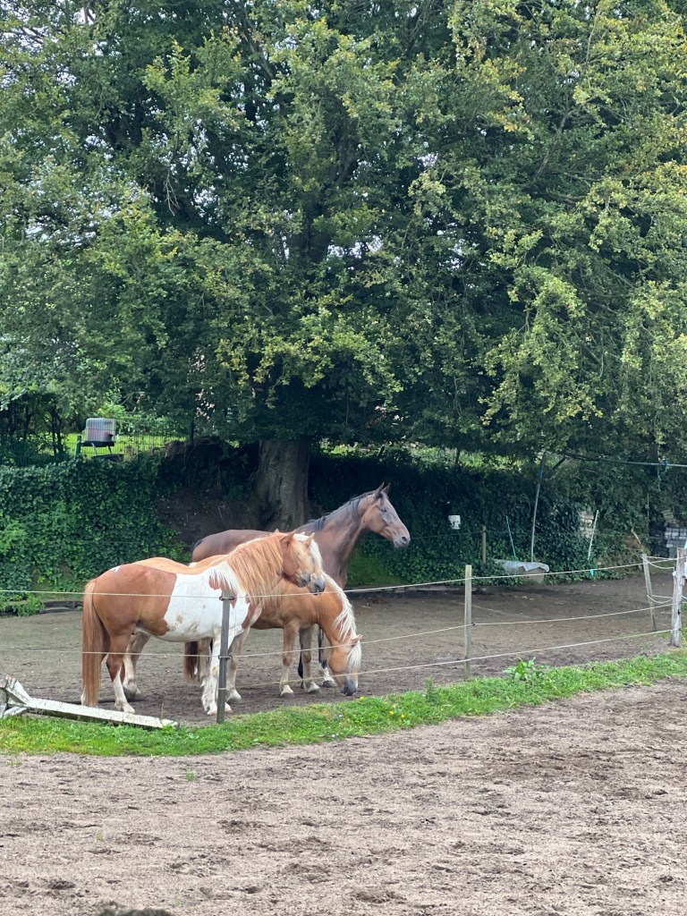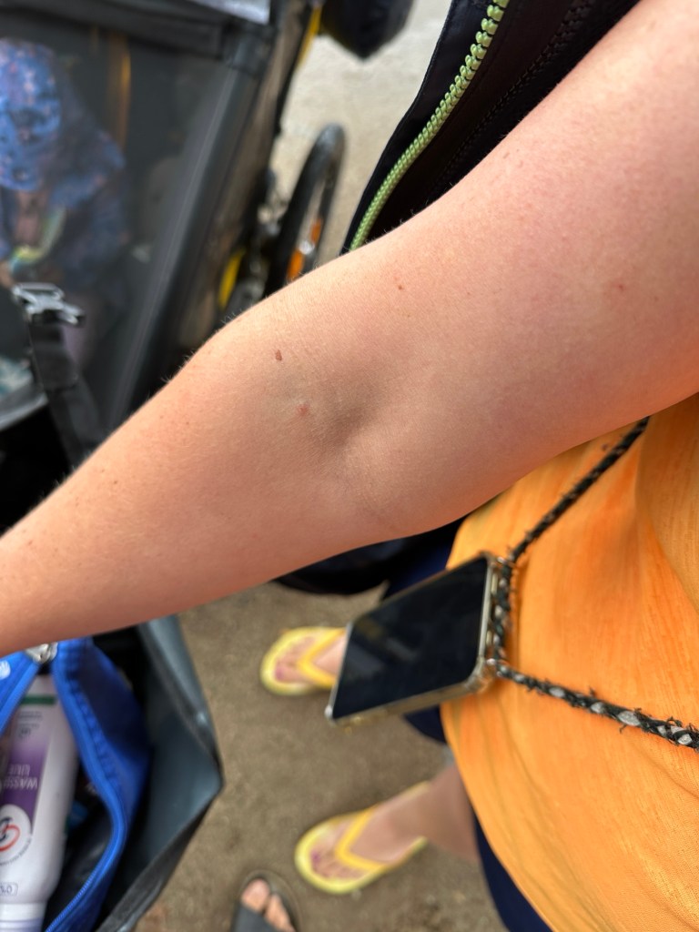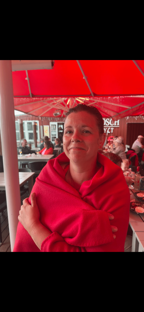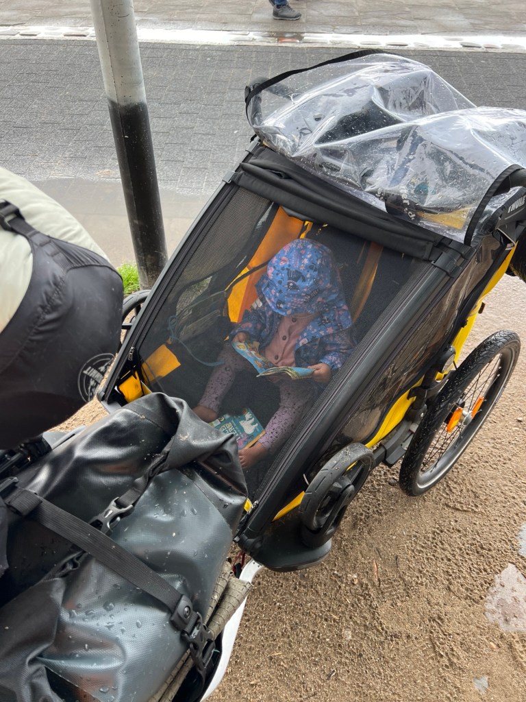 Während wir uns den Platz gesucht haben, fing es kräftig an zu regnen. Lu hat die Räder in Sichtweite zur Terrasse gefahren, während ich mit den Kindern den Platz eingenommen habe. Sie hat auch die Lenkertaschen mit den Wertsachen und Jacken für die Kinder mitgebracht. Jetzt ist sie nass und wärmt und trocknet sich unter einer Decke des Restaurants. Und das mit ihrer latenten Erkältung. Wir hoffen das beste.