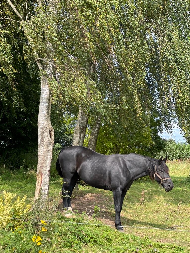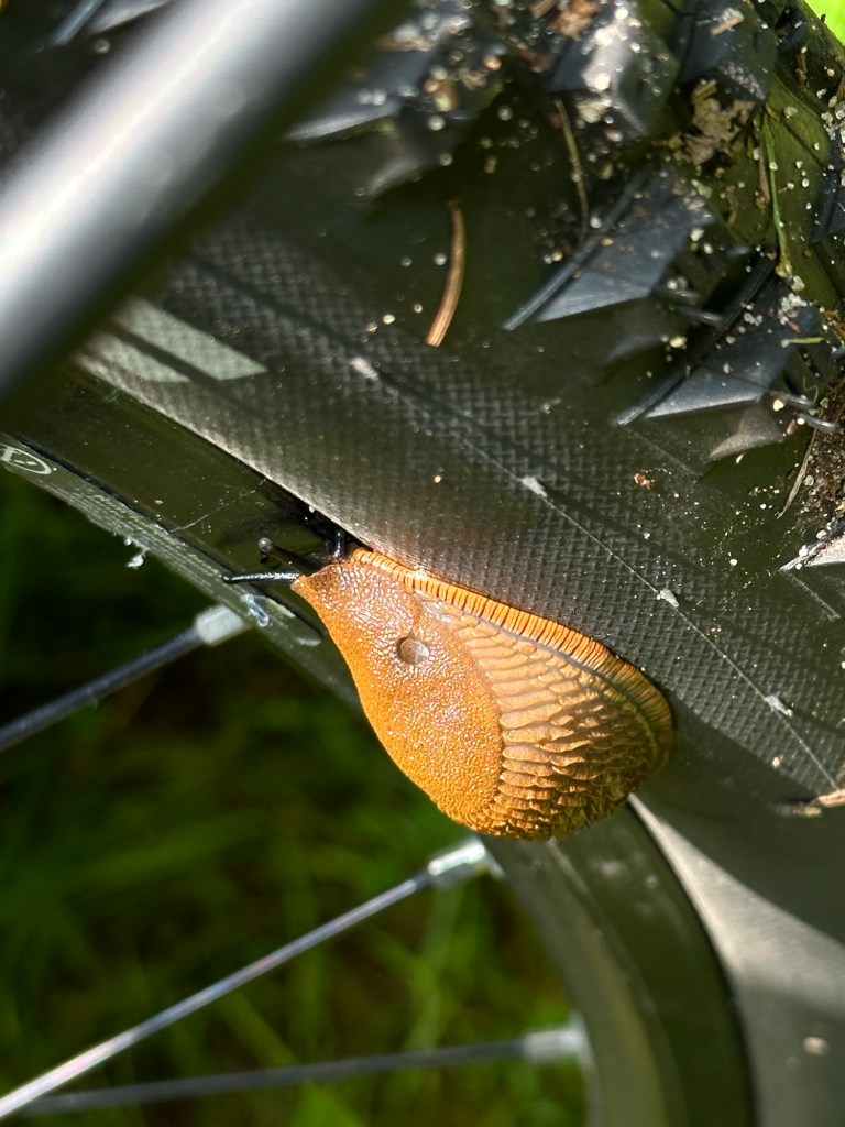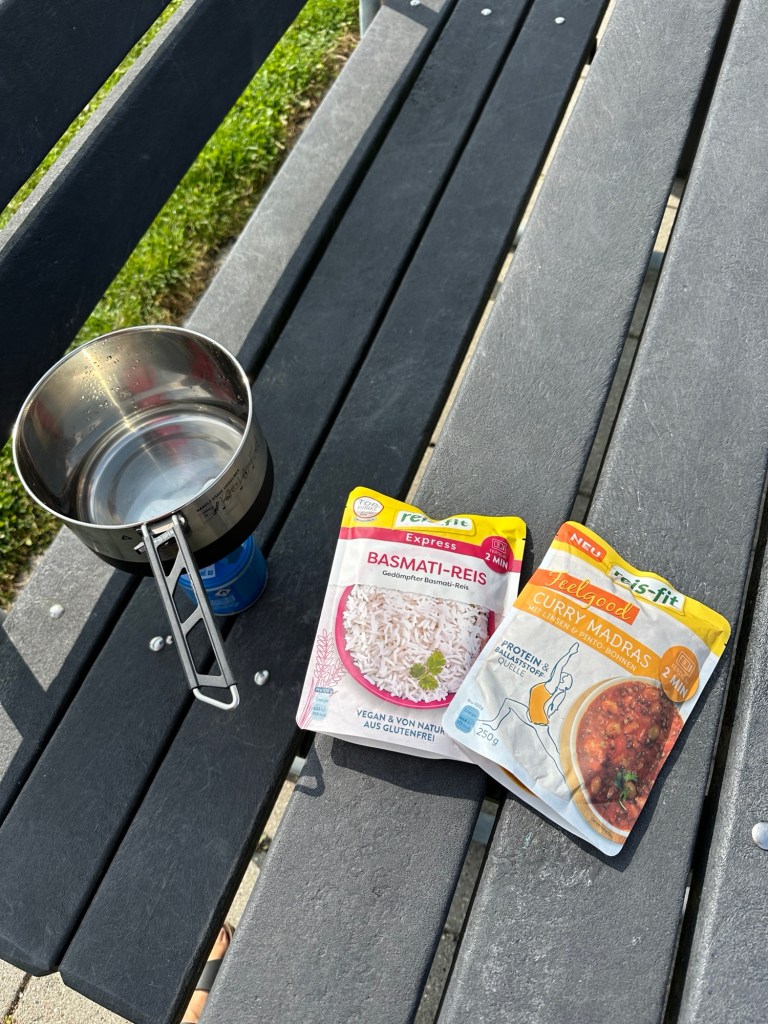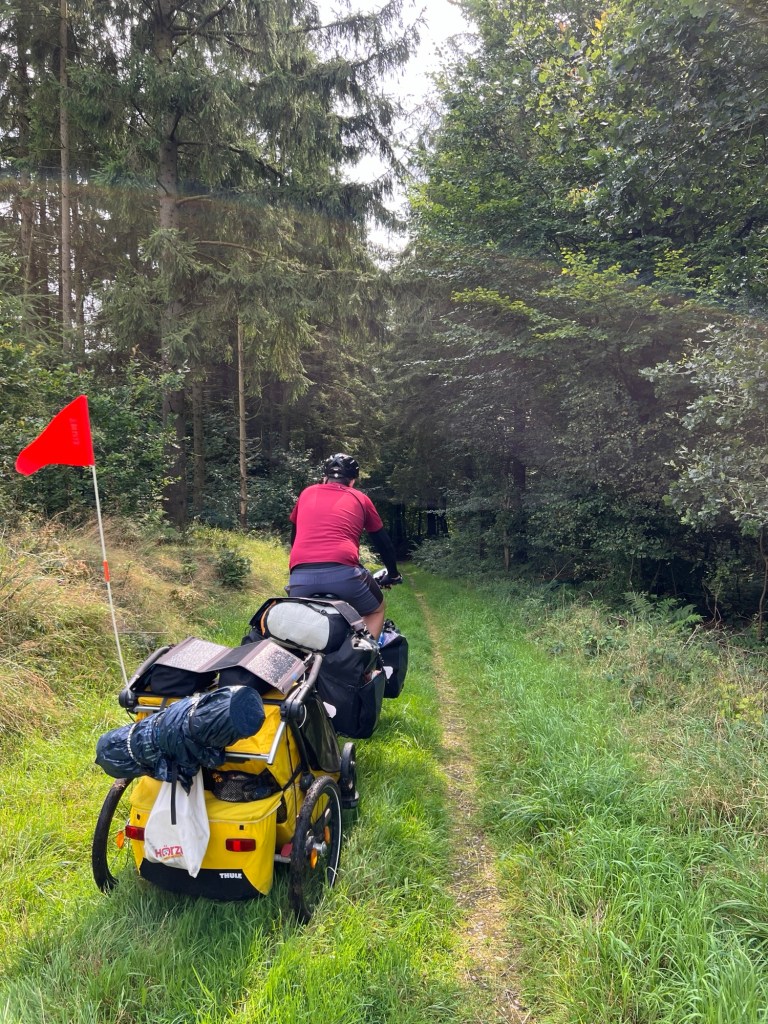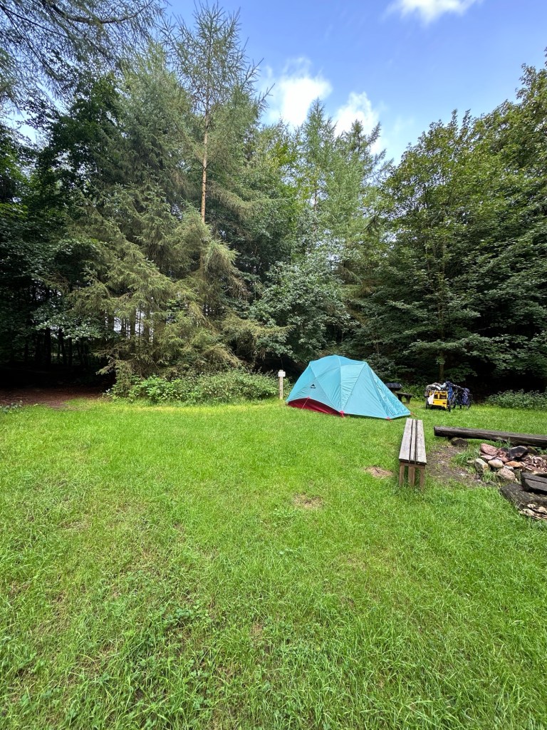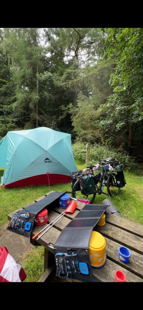 Wir stehen um 8:45 auf. Die Nacht war sehr Luftfeucht und das Gras ist sehr nass. Das Zelt ebenfalls. Die Sonne zieht langsam herum und scheint in die Lichtung. Ich baue die Solarpanels auf dem Picknicktisch auf und verschaffe ihnen mit unseren Buddeleimern etwas Neigung. Wir bauen ab und packen das Zelt relativ nass ein. Es war ein schöner, ruhiger Ort und es waren insgesamt nur 3 km Umweg von unserer Route.Auf den ersten 5 km geht es schön knapp 3 km bergauf. Ein guter Start in den Tag.