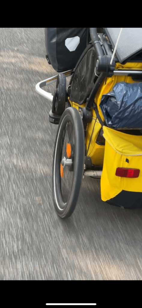 Wir fahren weiter und ich halte Abstand von Lu und den Kindern und vor allem dem Anhänger. Ich stecke mir Taschtuchfetzen in die Ohren, wie ich es zu Hause machen, wenn ich akustisch überreizt bin. Das hilft etwas gegen das Knarzen des Anhängers, ist im Verkehr allerdings nicht sonderlich sicher. Es bricht beim Fahren noch ein paar mal aus mir heraus, aber ich beruhige mich langsam und hole irgendwann wieder auf. Ich bedanke mich bei Lu, dass sie den Anhänger übernommen hat.
