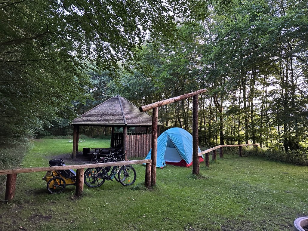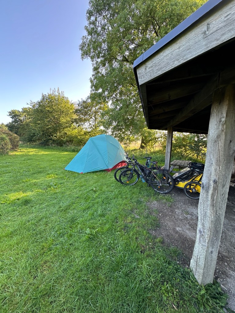 Um kurz nach acht finden wir unser Nachtlager. Bei den örtlichen Spejder (Pfadfinder). Es ist keiner da, aber auf dem hinteren Teil des Geländes gibt es mal wieder ein Pavillon und eine Wiese. Außerdem haben sie auch zwei kleine Shelter dort stehen, aber wir schlafen, wie immer, im Zelt. Die Große hat gehört, dass wir hier auf dem Gelände der Pfadfinder sind und sagt, dass sie heute oder morgen zu den Pfadfindern möchte und wir sagen ihr, dass wir in Berlin ja mal schauen können, ab welchem Alter sie zu den Pfadfindern könnte. Der Gedanke, dass sie zu den Pfadfinder gehen könnte, rührt uns sehr.