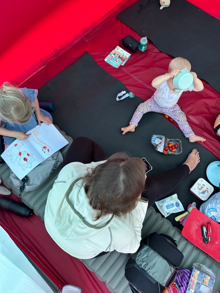 Der Tag beginnt sehr entspannt. Die Kinder spielen im Zelt. Die Große malt und die Kleine spielt mit verschiedenen Dingen aus unserem Gepäck. Wir haben Mal- und Buddelsachen, Bücher und eine Toniebox inkl. einer Hand voll Tonies dabei. Trotzdem ist oft die Tasche mit den Zahnputzsachen interessanter. Oder die leeren Dosen, die Wickeltasche, die Kopfkissentaschen, die Schuhe oder, oder, oder. Das ist das schöne, bei so kleinen Kindern. Sie entdecken noch so vieles und sind inspiriert. Das wird sich irgendwann leider ändern und dann sind Sachen lame und die Ansprüche steigen. So zumindest meine Einschätzung aus Anekdoten anderer. Wir lassen es auf uns zukommen.