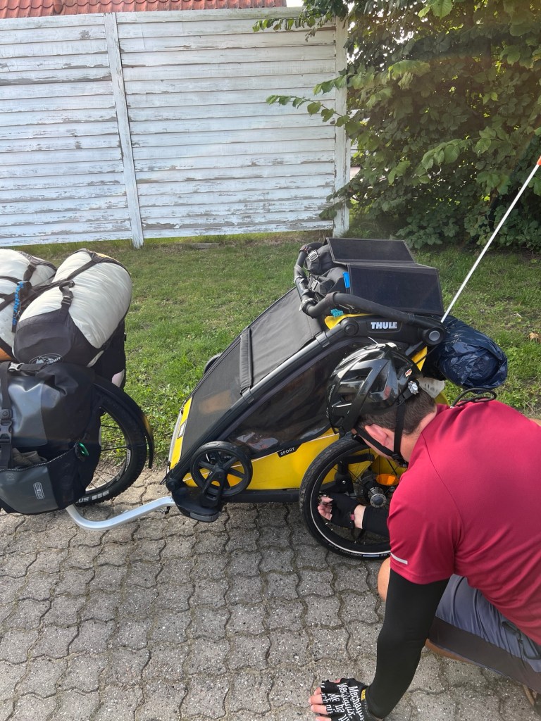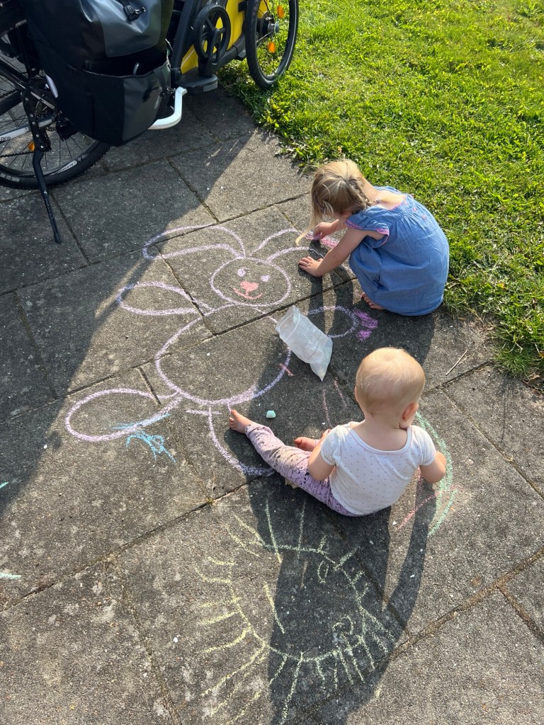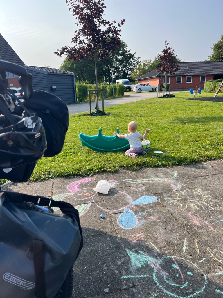 Nach dem Essen wird noch ausgiebig gespielt und mit Kreide gemalt. Als wir wieder los wollen, bin ich durch die Kinder plötzlich so genervt, dass ich die Nerven verliere. Ich reagiere pampig, den Kindern und Lu gegenüber und ich weiß nicht, wohin mit mir oder meinen Emotionen. Ich möchte einfach nur weg und weiter. Heute fahre ich den Anhänger und wenn ich gereizt bin, bin ich bereits reizüberflutet. Unser Anhänger hat ein ohrenbetäubendes Knarzen entwickelt, das wir erst am rechten Rad hatten und seit einigen hundert Kilometern stattdessen auf dem linken Rad. In meiner aktuellen Stimmung ertrage ich nicht. Lu hört mich fluchen und sagte das sie den Anhänger übernimmt. Ich halte an und möchte den Anhänger entkoppeln, aber selbst das schaffe ich nervlich nicht mehr, weil es Feinmotorik und etwas Kraft benötigt. Lu übernimmt auch das. Wir sind am Rande der Siedlung und ich kann meine Emotionen nicht mehr halten. Neben einer Hecke sinke ich zusammen und es bricht einfach aus mir heraus. Ich heule Rotz und Wasser. Mir ist gerade alles egal, sonst könnte ich nicht so loslassen. Ich bin total überfordert mit der Situation und ich habe keinen Bock mehr. Für den Moment.