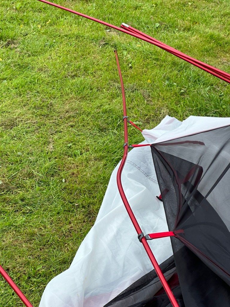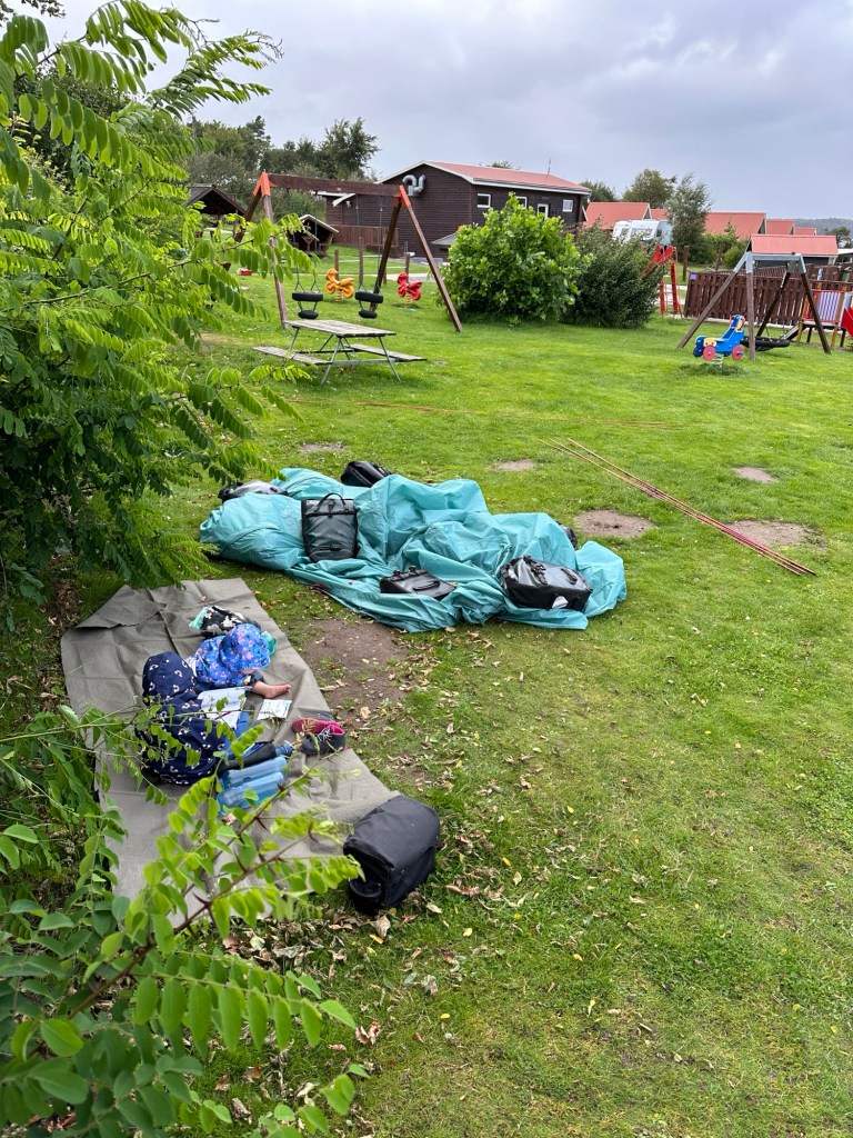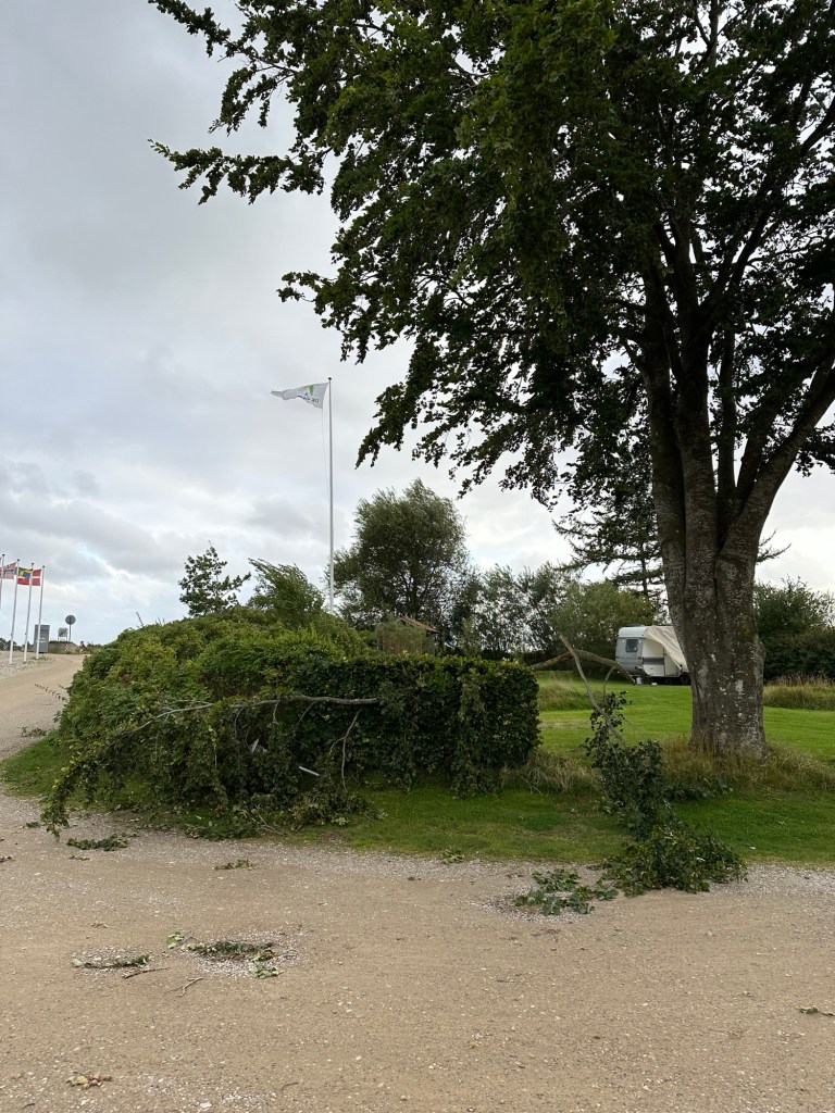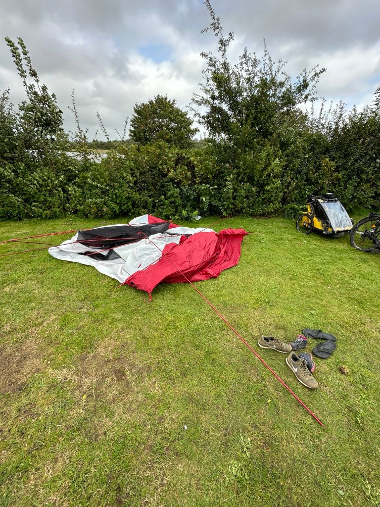 Ein paar Zeltstangen hat es verbogen und an einer Stelle, wo ein Haken das Innenzelt am Gestänge hält ist ein kleines Loch. Das ist sehr ärgerlich. Aber immerhin ist es nicht ganz weggeflogen. Ich gebe nur Bescheid und sie kommt bald mit den Kindern dazu. Bis dahin fange ich schon mal mit ein paar anderen Campern an Teile des Gepäcks in den Windschatten einer Hecke zu räumen. Es soll noch ein bisschen dauern, bis der Wind nachlässt und deshalb entscheiden wir uns, das Zelt ohne Gestänge im Windschatten flach auf dem Boden zu legen, die Zeitplane darüber und das Gepäck oben drauf zu deponieren. So sollte es nicht wegfliegen.
