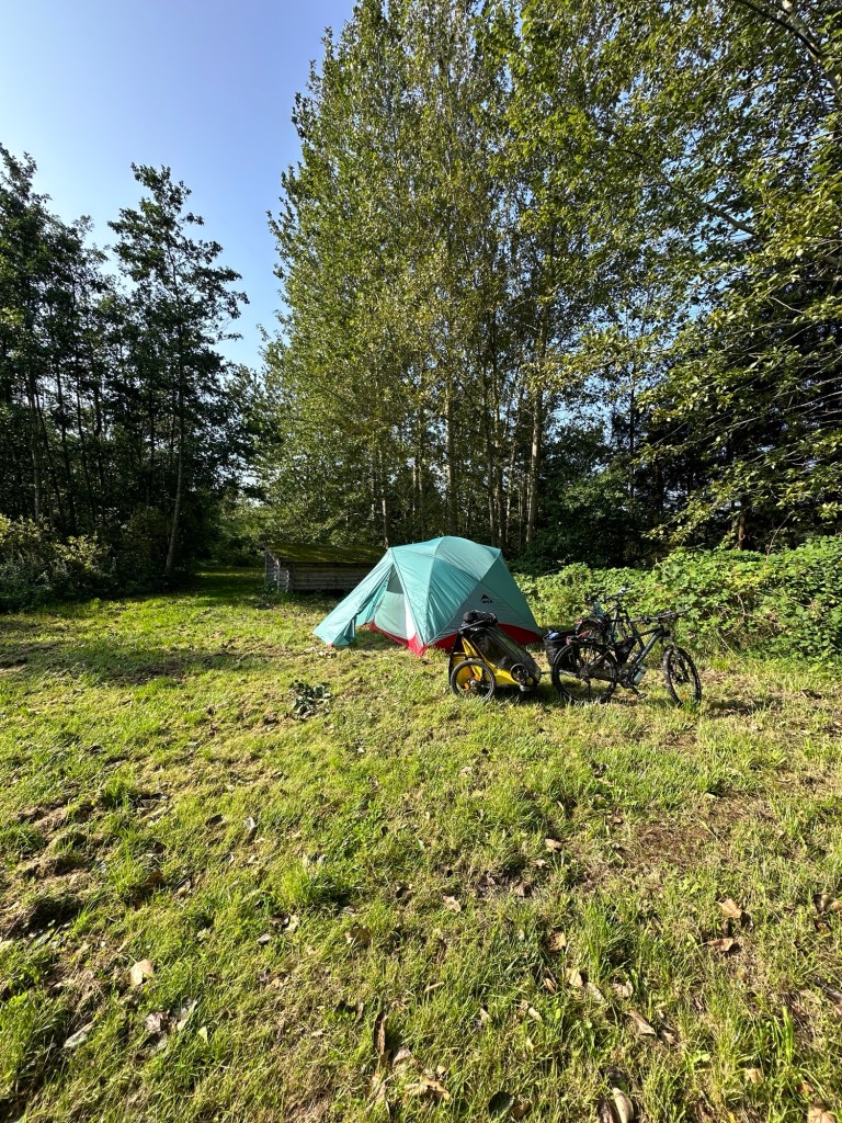 Wir wickeln die Kinder und verquatschen uns mit drei älteren Herren. Es ist spät als wir Aalborg verlassen und die Kinder schlafen beide während der Fahrt ein. Aufgrund der Fitness der Kinder fahren wir einen Shelter Platz an, der besser früher, als später kommen soll. Er liegt dicht an einer Autobahn, bietet aber ansonsten alles, was wir brauchen: Eine ebene Wiese und ein Klo.