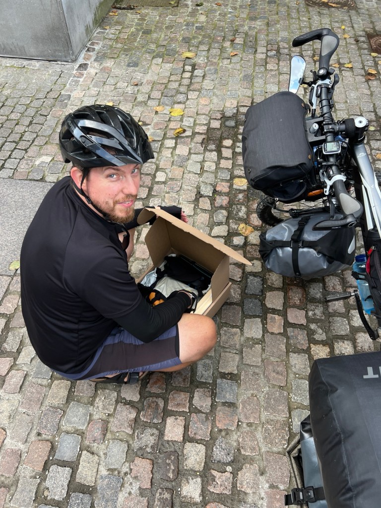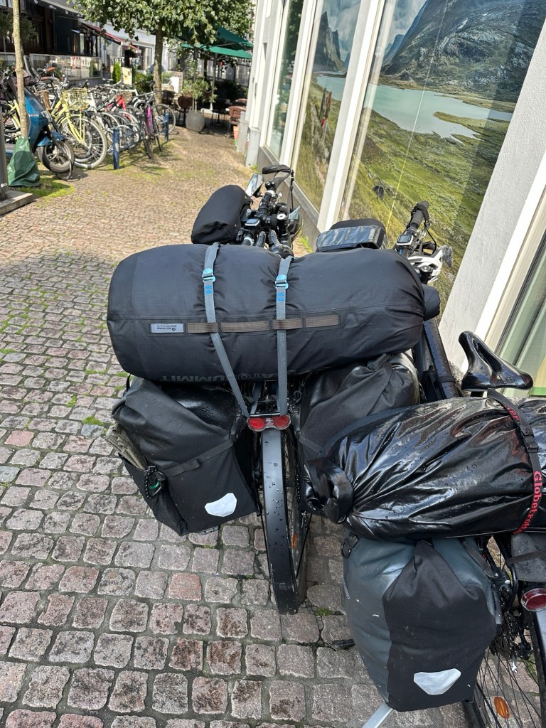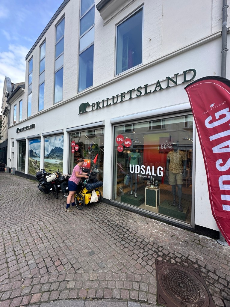 Gegen 13:00 Uhr kommen wir beim Friluftsland in Aalborg an. Wir parken die Räder direkt vor dem Laden, damit wir sie durch das Schaufenster etwas sehen können. Wir schließen sie zusammen und nehmen unsere Lenkertaschen mit. als wir im Laden sind, können wir aber schon bald unsere Räder nicht mehr sehen. Wir finden uns schnell damit ab und hoffen das Beste.