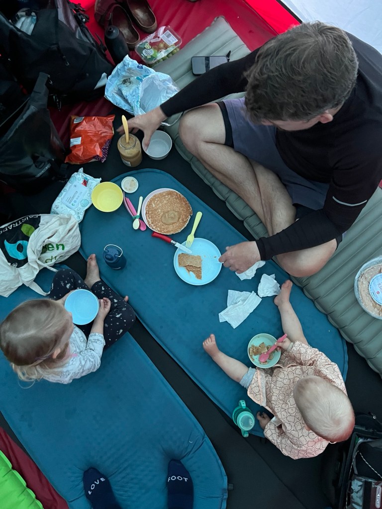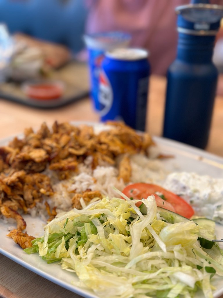 Im Anschluss an den teuren Einkauf, gehen wir noch etwas essen. Wir könnten jetzt auch sparen und etwas aus unseren Vorräten nehmen, aber es ist eine Bauchentscheidung. Pun intended. Wir wollen gerade zu einem Laden gehen, da fängt es an zu regnen. Wir stellen uns provisorisch unter die Markise eines Kebab-Ladens, woraufhin ein guter Schauer vom Himmel kommt. Die Kinder sind hungrig und müde und wir beschließen spontan hier einzukehren. Die Große will kuscheln und die Kleine möchte klettern. Es wird zwischenzeitlich recht laut und