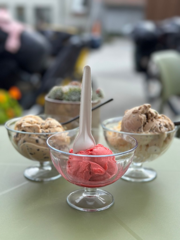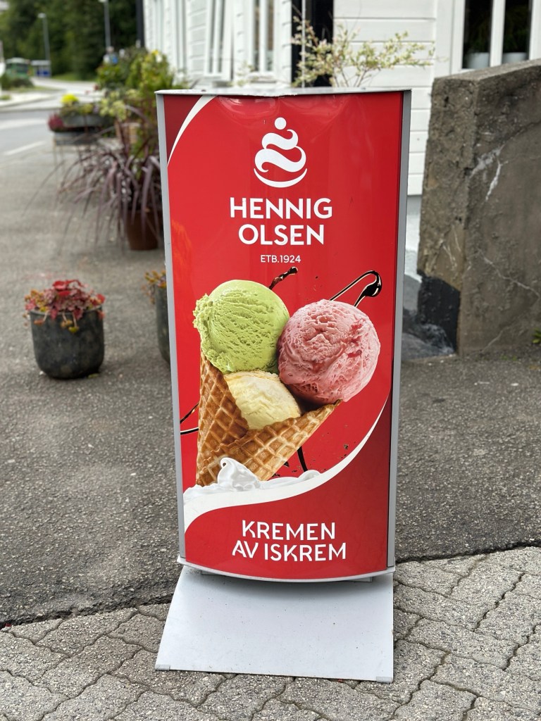Etwa eineinhalb Stunden Später sind wir in Hauge und kommen auf dem Weg zu einem Spielplatz an einem Café vorbei, dass sehr einladend aussieht. Da die Große sich jeden Tag Eis wünscht, wissen wir schon, was es für sie geben wird. Lu und ich holen uns Eis und Cappuccino und wir lassen es uns gutgehen. Hier treffen wir ein Paar aus Deutschland, das mit dem Camper unterwegs ist. Sie sprechen uns an, weil sie unsere Fahrräder, den Anhänger und die Kinder sehen und wir laden sie zum Plausch zu uns an den Tisch ein. Wir unterhalten uns eine ganze Weile angeregt über das auf-Tour-sein, wie wir von Berlin bis hierher gefahren sind und was unsere weitern Pläne sind, wo sie herkommen und wo es für sie noch hingehen soll.
