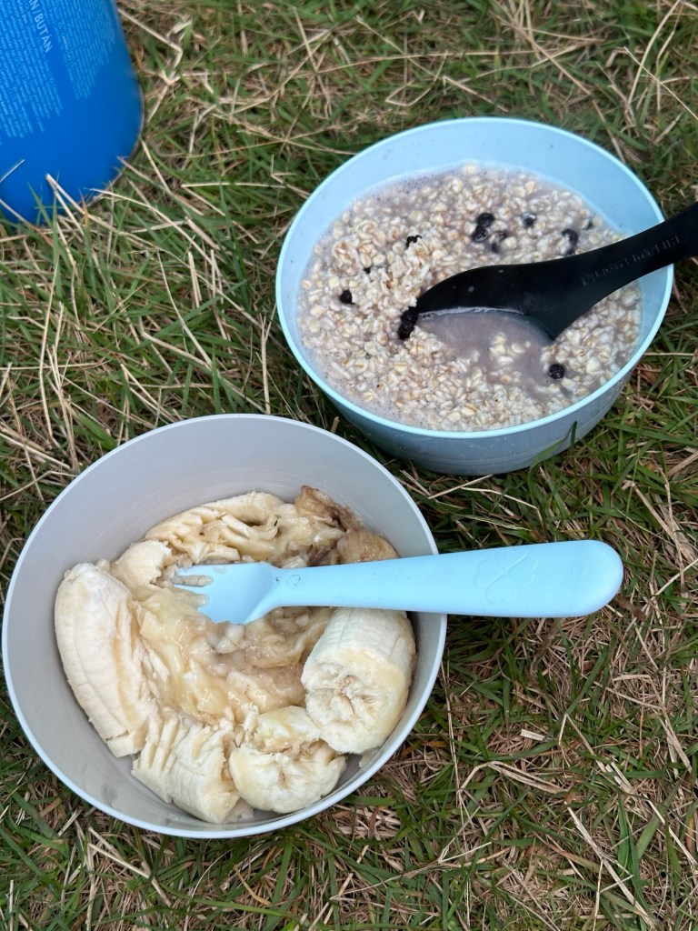 Heute sollen die Kinder duschen. Das machen wir eigentlich immer direkt vor dem ins Bett bringen, weil das Baden oder Duschen oft so aufregend und schlauchend ist, dass sie danach extra gut schlafen. Also gibt es vorher noch Abendessen. Es gibt Blaubeer-Porridge mit gequetschter Banane. Die beiden Offroad-Camper nebenan braten sich derweil Burger und der Duft zieht zu uns rüber. Ich sehe mir das Porridge an, was die Kinder gerne essen, wovon ich sofort Sodbrennen bekomme und würde mich am liebsten bei den beiden da drüben einladen. Lu tropft auch der Zahn. Aber gut, bei uns wird es später wieder Nachos geben. So lange müssen wir noch durchhalten.