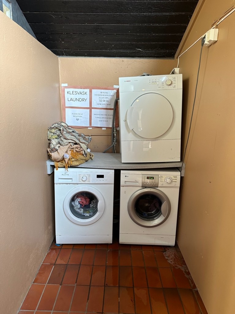 Lu sammelt unsere Wäsche zusammen und versucht als erstes am Kiosk Waschmittel aufzutreiben. Wir fahren nämlich keines mit uns herum, weil es normalerweise auf dem Campingplätzen in irgendeiner Form erhältlich ist. Hier leider nicht. Sie fragt sich bei den verbleibenden Campern durch. Beim dritten hat sie Erfolg. Die Ecke, in der die Waschmaschinen stehen sieht sehr vertrauenserweckend aus. In einer Nische stehen zwei Waschmaschinen nebeneinander, darüber eine Arbeitsplatte, auf der der Wäschetrockner steht und die Platte fast in die Knie zwingt. Vor dem Waschmaschinen liegt eine große seifige Pfütze. Hauptsache, wir bekommen unsere Sachen hier gewaschen. Das klappt tatsächlich soweit, aber der Trockner macht Probleme und wir werfen ihn mehrfach an. Immerhin ist die Nutzung kostenlos.
