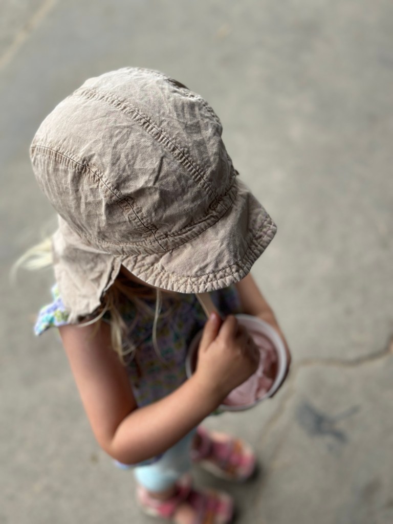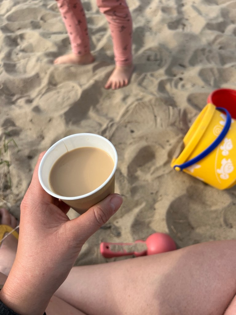 Nach dem Essen spielen die beiden weiter im Sand und auf der Plattform. Wir werden mit Kuchen und Eis (in Sandform) versorgt und die kleine klettert unentwegt auf die Plattform rauf und wieder runter. Gestern haben wir ja Instant Kaffee geschenkt bekommen. Und jetzt ist ein guter Zeitpunkt für ein kleines Käffchen … zum Sandkuchen.