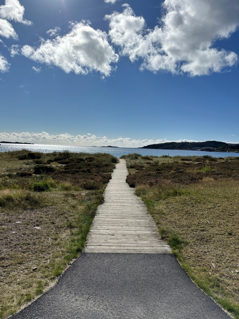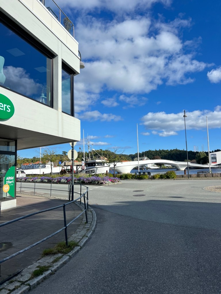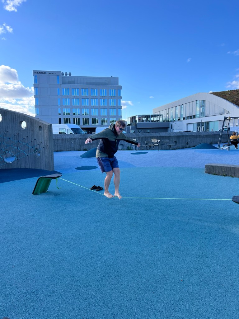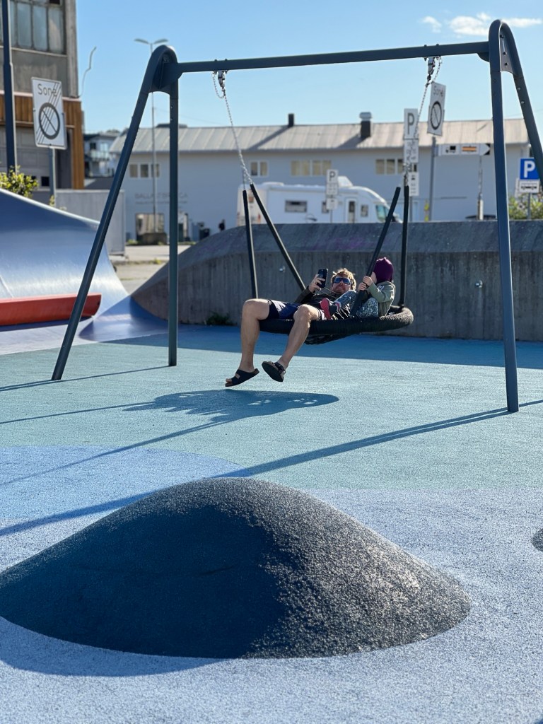 Wir fahren nach einer rasanten Abfahrt durch das schöne Mandaler Umland, dann dem Skogsfjord folgend, schließlich über einen am Hang liegenden Golfplatz mit heftig steilem Anstieg in die Stadt. Als erstes peilen wir einen Spielplatz in der Nähe des Hafens an. Hier wird erstmal gewickelt und Kleidung in der Sonne getrocknet. Es pfeift ein eisiger Wind und wir packen die Kinder so warm es geht ein. Nun wird alles auf dem Spielplatz ausgiebig getestet und wir widmen uns der Suche nach einem geeigneten Ort für die Nahrungsaufnahme. Wir sind hungrig und wollen gern in ein Restaurant oder Lokal. Die Wahl fällt schließlich auf eine Pizzakette (Pizzabakeren). Leider stellen wir erst bei Ankunft fest, dass es sich eher um einen Lieferdienst handelt und es drinnen nur zwei Barhocker als Sitzplätze gibt für Kunden, die auf ihre Bestellung warten. Wir bestellen trotzdem und setzen uns draußen im Kalten an einen Tisch.