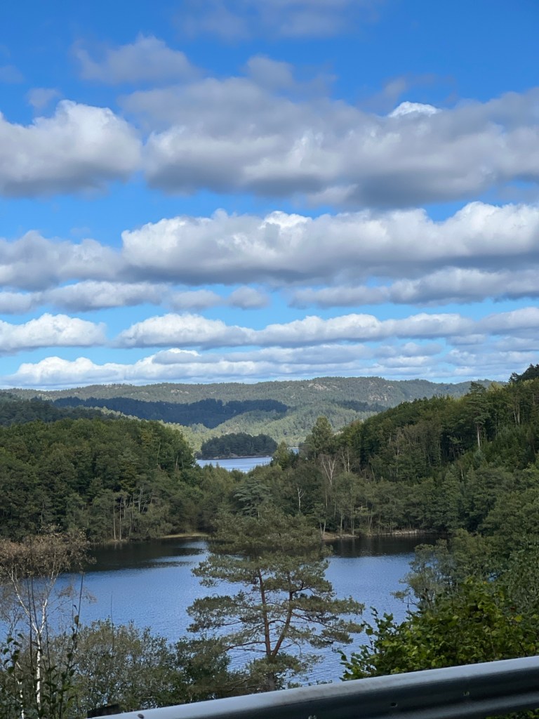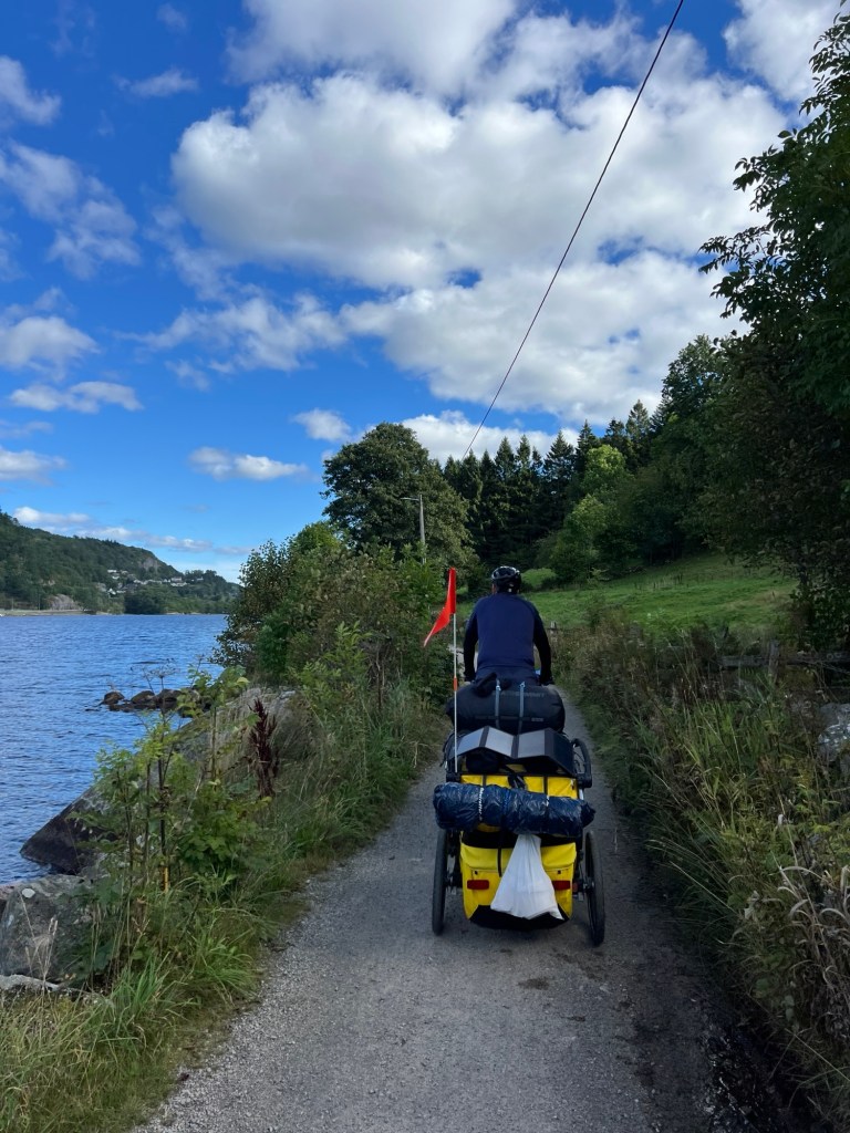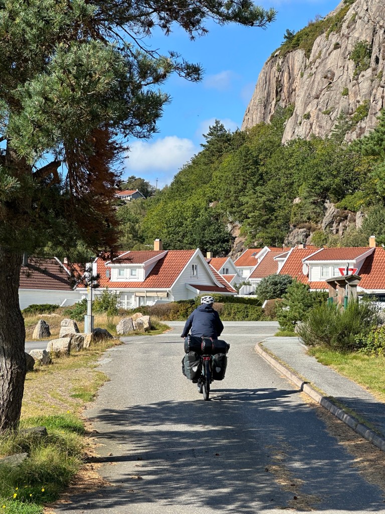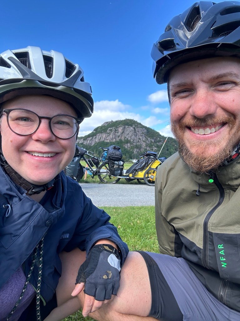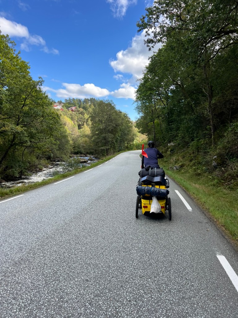 Wir schaffen es schließlich vom Campingplatz in Spangereid runter und machen noch ein Selfie, da ist die Kleine schon fast eingeschlafen. Wir haben inzwischen Mitte September. Die Sonne strahlt, aber der Wind ist knackig kalt. Das spüren wir vor allem, wenn wir die gerade mühsam erklommenen Höhenmeter mit hohem Tempo wieder runterfahren. Der Fahrtwind ist dann gerade im Schatten der Bäume eisig. Dennoch bevorzuge ich es kurzärmelig und Bodo in offenen Schuhen zu fahren