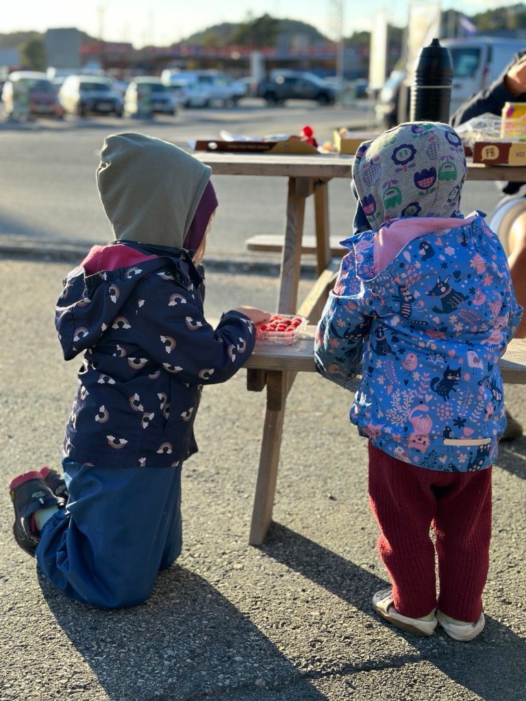 Während die Pizza zubereitet wird, besorge ich beim Rema 1000 nebenan Himbeeren und frisches Brot, Frühlingszwiebeln und Tomaten für unser Frühstück. Die Himbeeren werden an Ort und Stelle von den Mädels vertilgt. Die Pizzen sind gut, vor allem die mit salzigem Speck kommt gut bei den Kindern an. Der Pizza Belag unterscheidet sich stark von dem, was wir aus Deutschland gewohnt sind. Es gibt viel Fleisch, oft Hackfleisch, keinen Schinken, eher Bacon oder Kebab. Wir versuchen immer, etwas zu finden, wo es Überschneidungen beim Geschmack der Kinder mit unserem eigenen gibt. Das ist hier in Norwegen eine ganz andere Herausforderung.