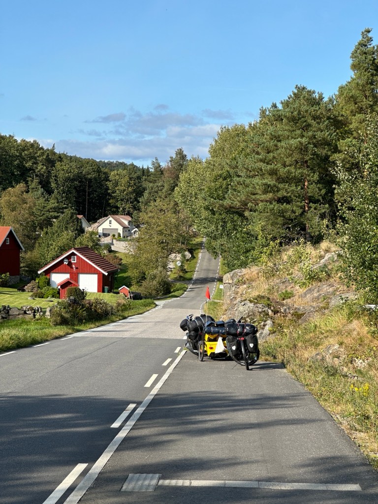 Als Lu das Zelt fertig abgebaut hat, holen wir sie ab. Wir machen nochmal einen Stopp am Spielplatz und treffen dort auf eine Einheimische, die mit ihren Kindern auf dem dem Campingplatz ist und selber regelmäßig mit dem Rad reist und zeltet. Sie ist eine aufgeweckte und lebensfrohe Person und unter anderem sagt sie zu uns „You are crazy and you know it“. Wir unterhalten uns eine Weile mit ihr und ihrer Schwester, die auch mit ihren Kindern dort ist. Sie kommen beide aus Kristiansand, was wir wahrscheinlich morgen erreichen sollten. Es sind noch über 70 km bis dort hin. Wir sind noch nicht sicher, wie wir vorankommen und ob wir vor, in oder hinter Kristiansand rasten werden. Allerdings bekommen wir schonmal eine Empfehlung für einen tollen Campingplatz in Kristiansand. Was wir jetzt noch nicht wissen: Der Campingplatz in Kristiansand hat heute den letzten Tag geöffnet. Aber dazu mehr, wenn es soweit ist.